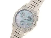 曲線と直線が生み出す立体的なデザインが特徴的なパンテオンシリーズ。パンテオンとはギリシア語で「万神殿」という意味で、古代ローマの円形神殿を表しています。立体感のあるインデックスや、マットとポリッシュのステンレス素材など、細部まで作り込まれた1本に仕上げられています。こちらはダイヤベゼルにシェル文字盤がエレガントな印象です。