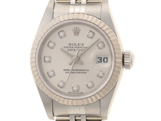 ロレックスの人気定番モデル、79174Gです。シルバー文字盤に10ポイントのダイヤモンドがセッティングされたラグジュアリーな時計です。